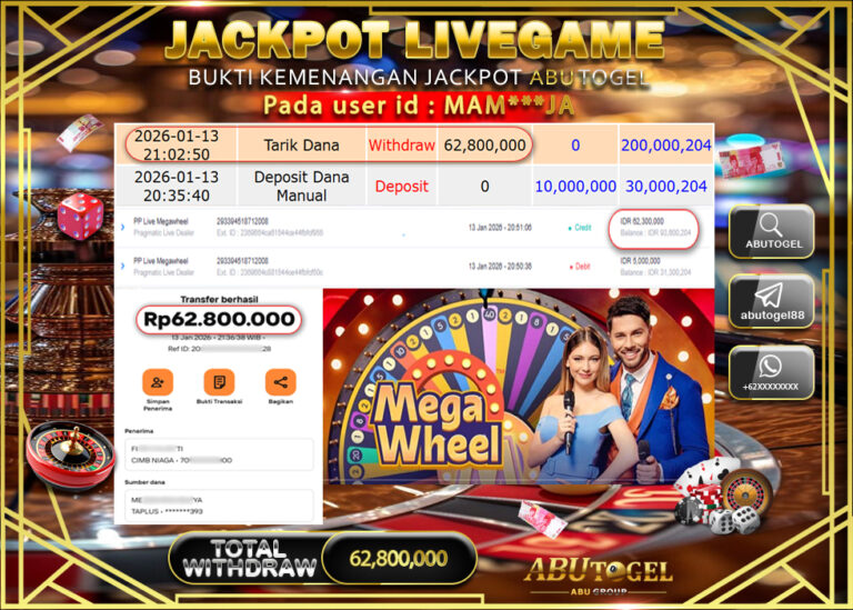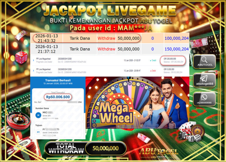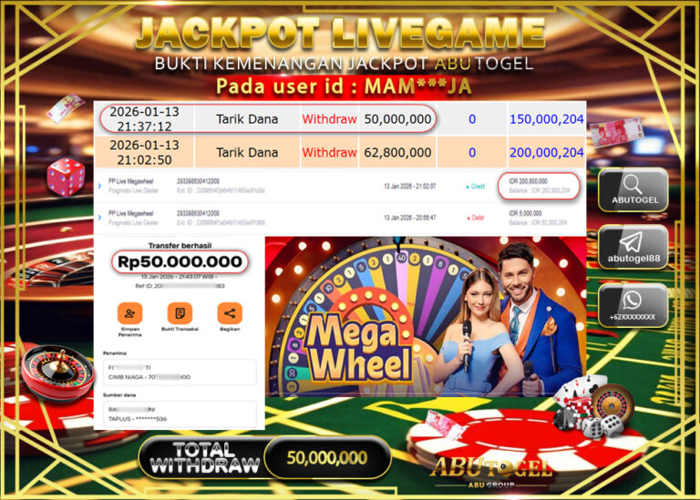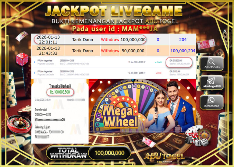Bukti Jackpot ABUTOGEL Live Casino Selasa 13 January 2026 - ABUTOGEL adalah situs live casino terpercaya. Berikut ini kami berikan...