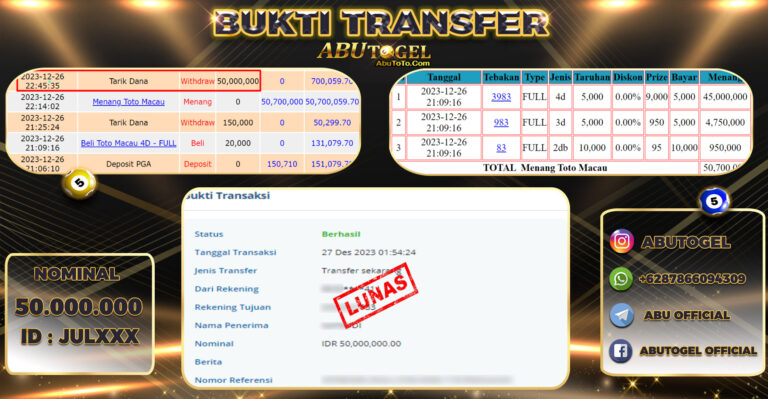 Bukti Jackpot Togel Online ABUTOGEL Selasa 26 Desember 2023 - ABUTOGEL adalah bo togel onlinne terpercaya. Berikut ini kami berikan...
