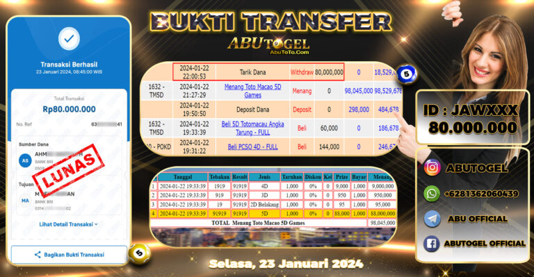 Bukti Jackpot Togel Online ABUTOGEL Selasa 23 Januari 2024 - ABUTOGEL adalah bo togel onlinne terpercaya. Berikut ini kami berikan info...
