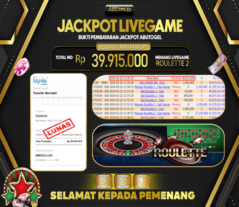 Bukti Jackpot ABUTOGEL Live Casino Kamis 22 Februari 2024 - ABUTOGEL adalah situs live casino terpercaya. Berikut ini kami berikan...