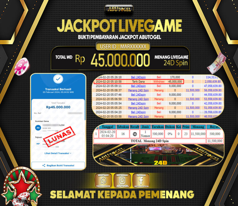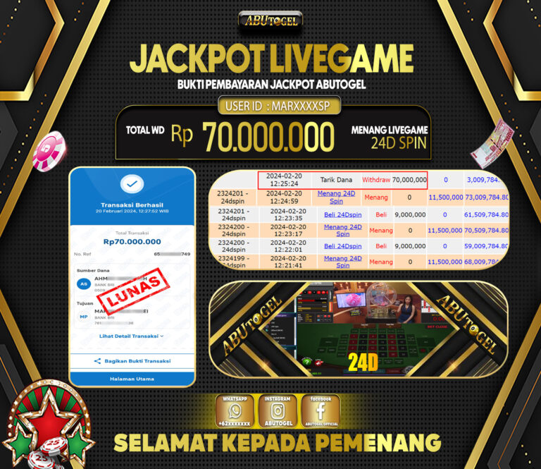 Bukti Jackpot ABUTOGEL Live Casino Rabu 21 Februari 2024 - ABUTOGEL adalah situs live casino terpercaya. Berikut ini kami berikan...