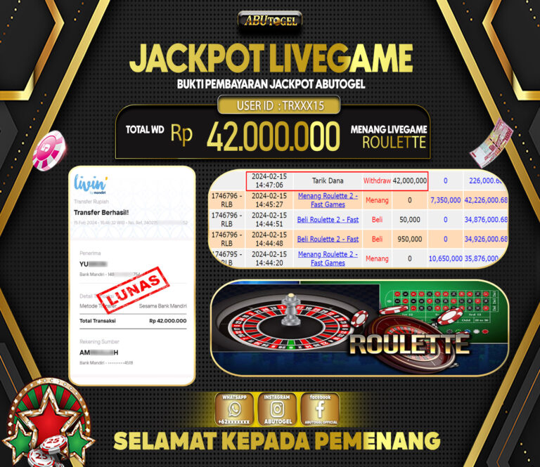 Bukti Jackpot ABUTOGEL Live Casino Kamis 15 Februari 2024 - ABUTOGEL adalah situs live casino terpercaya. Berikut ini kami berikan...