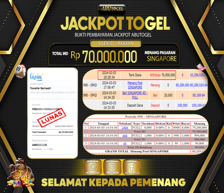 Bukti Jackpot Togel Online ABUTOGEL Minggu 03 Maret 2024 - ABUTOGEL adalah bo togel onlinne terpercaya. Berikut ini kami berikan info...