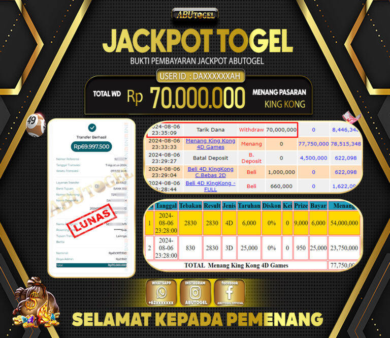 Bukti Jackpot Togel Online ABUTOGEL Rabu 07 Agustus 2024 - ABUTOGEL adalah bo togel onlinne terpercaya. Berikut ini kami berikan info...