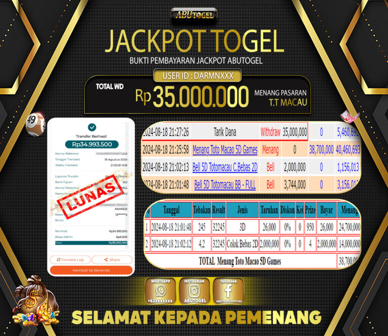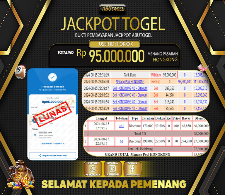 Bukti Jackpot Togel Online ABUTOGEL Kamis 15 Agustus 2024 - ABUTOGEL adalah bo togel onlinne terpercaya. Berikut ini kami berikan info...