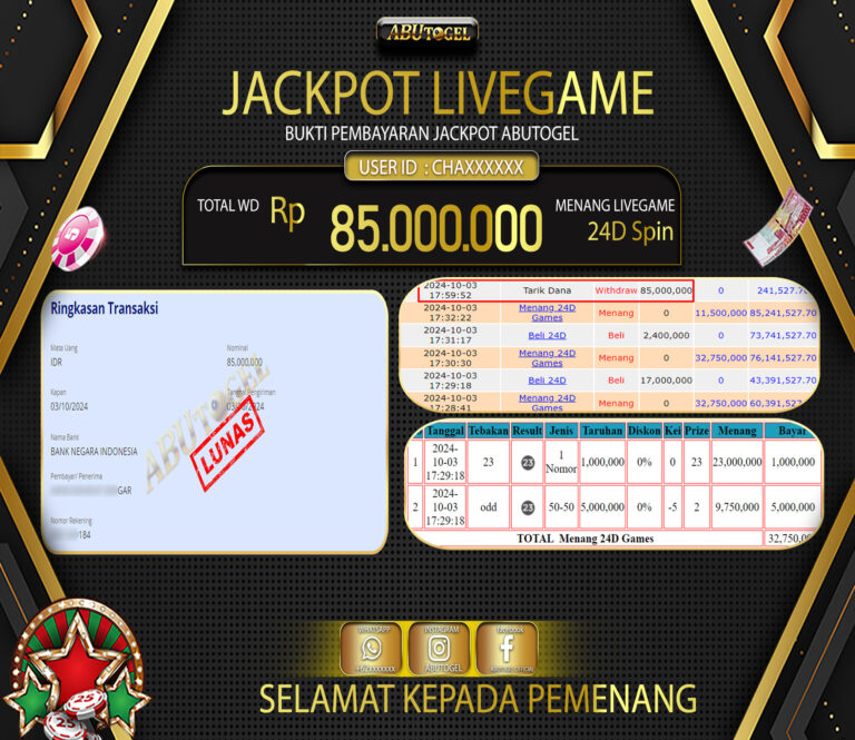 Bukti Jackpot ABUTOGEL Live Casino Kamis 03 Oktober 2024 - ABUTOGEL adalah situs live casino terpercaya. Berikut ini kami berikan info...