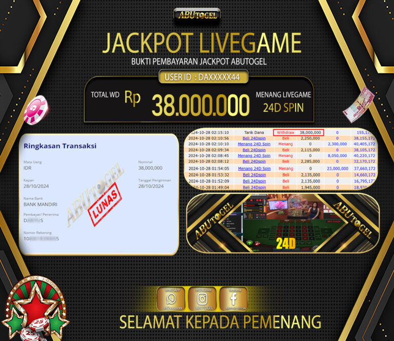 Bukti Jackpot ABUTOGEL Live Casino Senin 28 Oktober 2024 - ABUTOGEL adalah situs live casino terpercaya. Berikut ini kami berikan info...