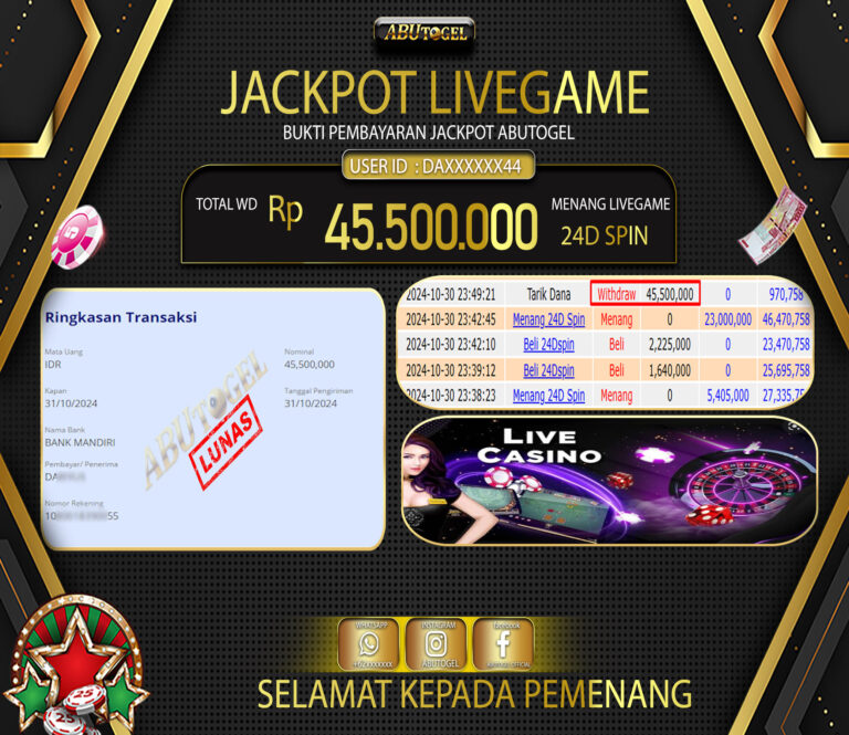 Bukti Jackpot ABUTOGEL Live Casino Kamis 31 Oktober 2024 - ABUTOGEL adalah situs live casino terpercaya. Berikut ini kami berikan info...