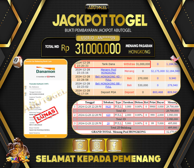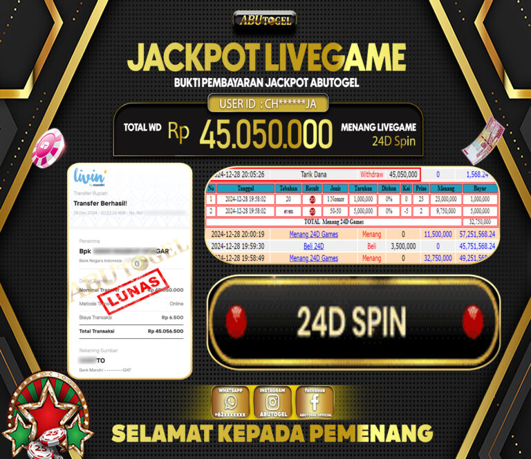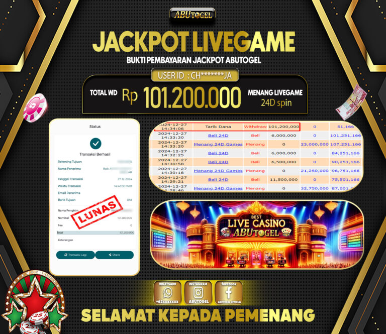 Bukti Jackpot ABUTOGEL Live Casino Minggu 29 Desember 2024 - ABUTOGEL adalah situs live casino terpercaya. Berikut ini kami berikan info...