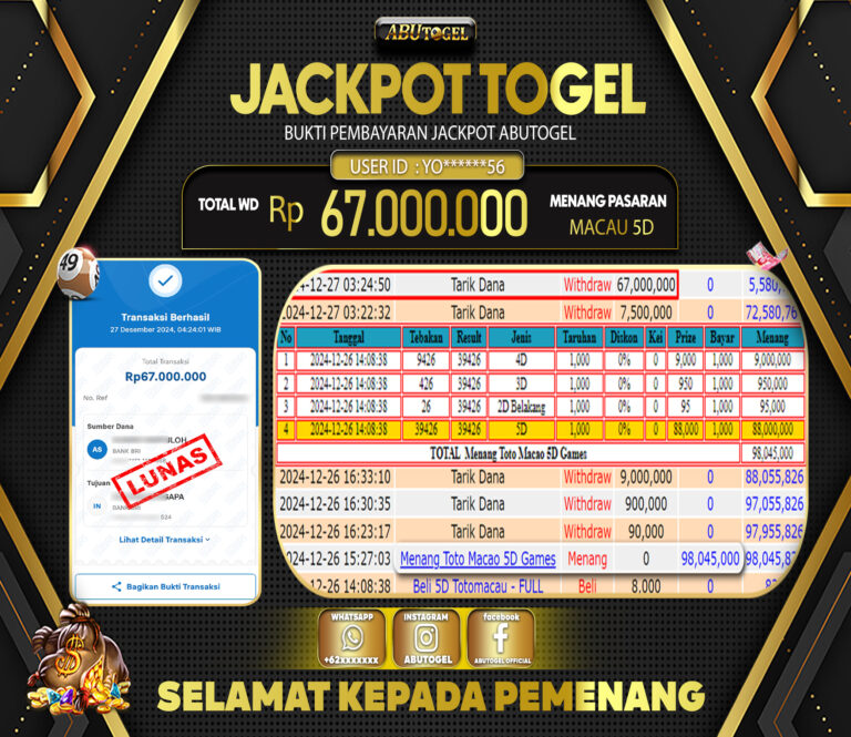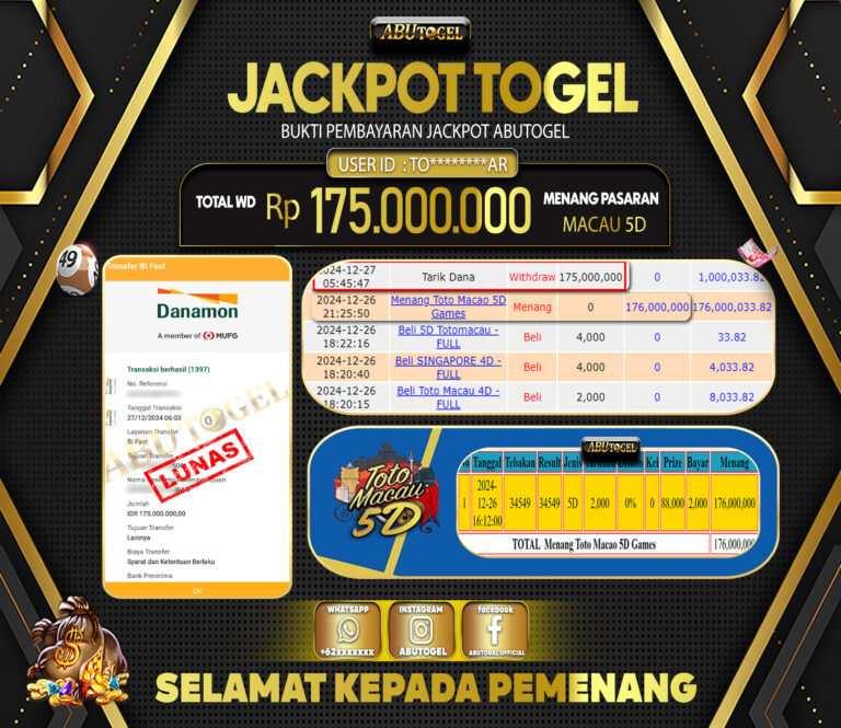Bukti Jackpot Togel Online ABUTOGEL Jumat 27 Desember 2024 - ABUTOGEL adalah bo togel onlinne terpercaya. Berikut ini kami berikan info...