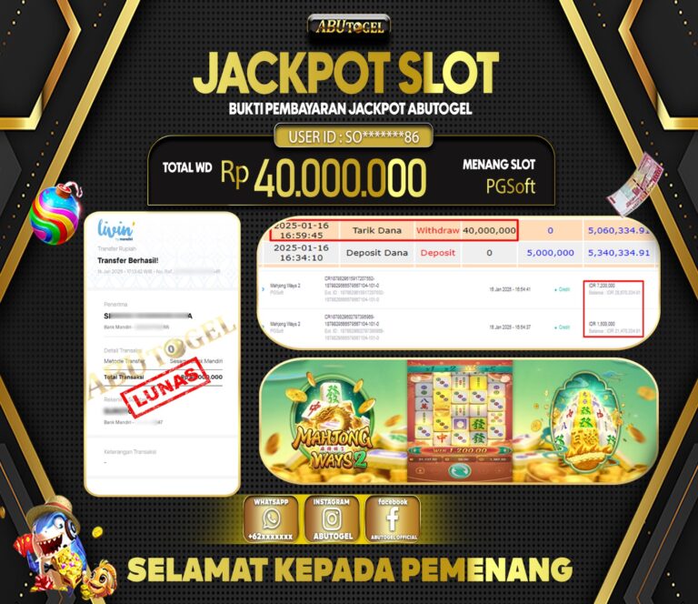 Bukti Jackpot ABUTOGEL Slot Online Kamis 16 Januari 2025 - ABUTOGEL adalah situs slot gacor maxwin terpercaya. Berikut ini kami berikan...