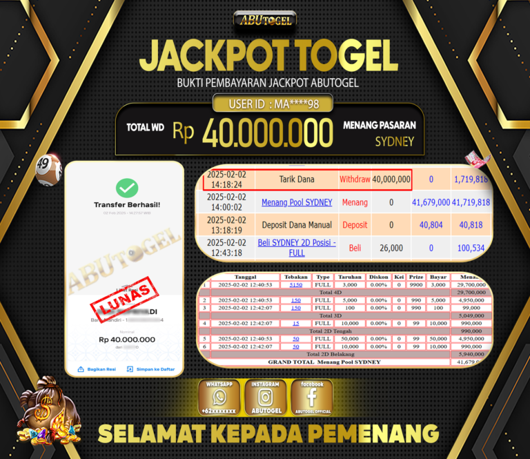 Bukti Jackpot Togel Online ABUTOGEL Minggu 02 Febuari 2025 - ABUTOGEL adalah bo togel onlinne terpercaya. Berikut ini kami berikan info...