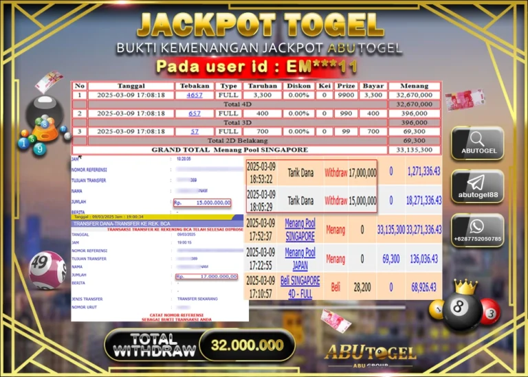 Bukti Jackpot Togel Online ABUTOGEL Minggu 09 Maret 2025 - ABUTOGEL adalah bo togel onlinne terpercaya. Berikut ini kami berikan info...