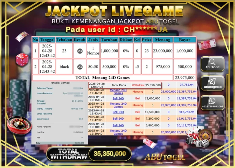 Bukti Jackpot ABUTOGEL Live Casino Senin 28 April 2025 - ABUTOGEL adalah situs live casino terpercaya. Berikut ini kami berikan info...