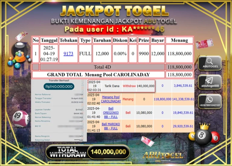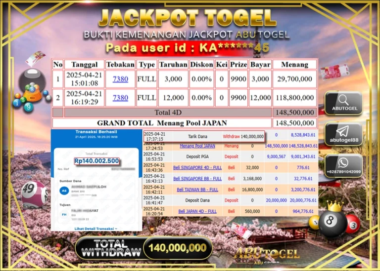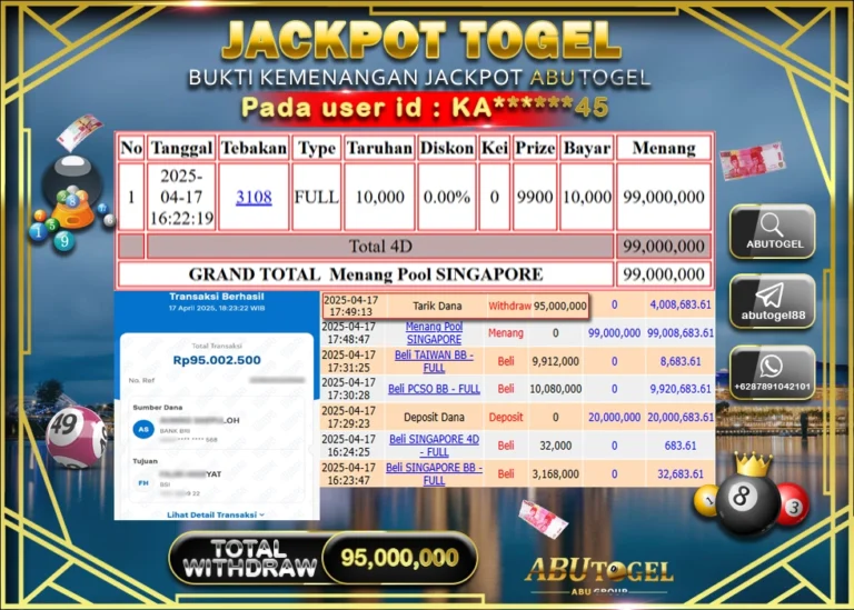 Bukti Jackpot Togel Online ABUTOGEL Minggu 20 April 2025 - ABUTOGEL adalah bo togel onlinne terpercaya. Berikut ini kami berikan info...