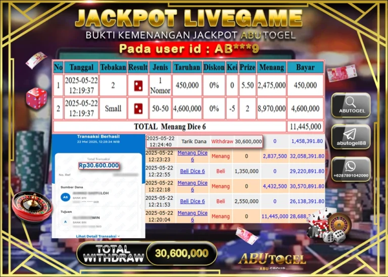 Bukti Jackpot ABUTOGEL Live Casino Kamis 22 Mei 2025 - ABUTOGEL adalah situs live casino terpercaya. Berikut ini kami berikan...