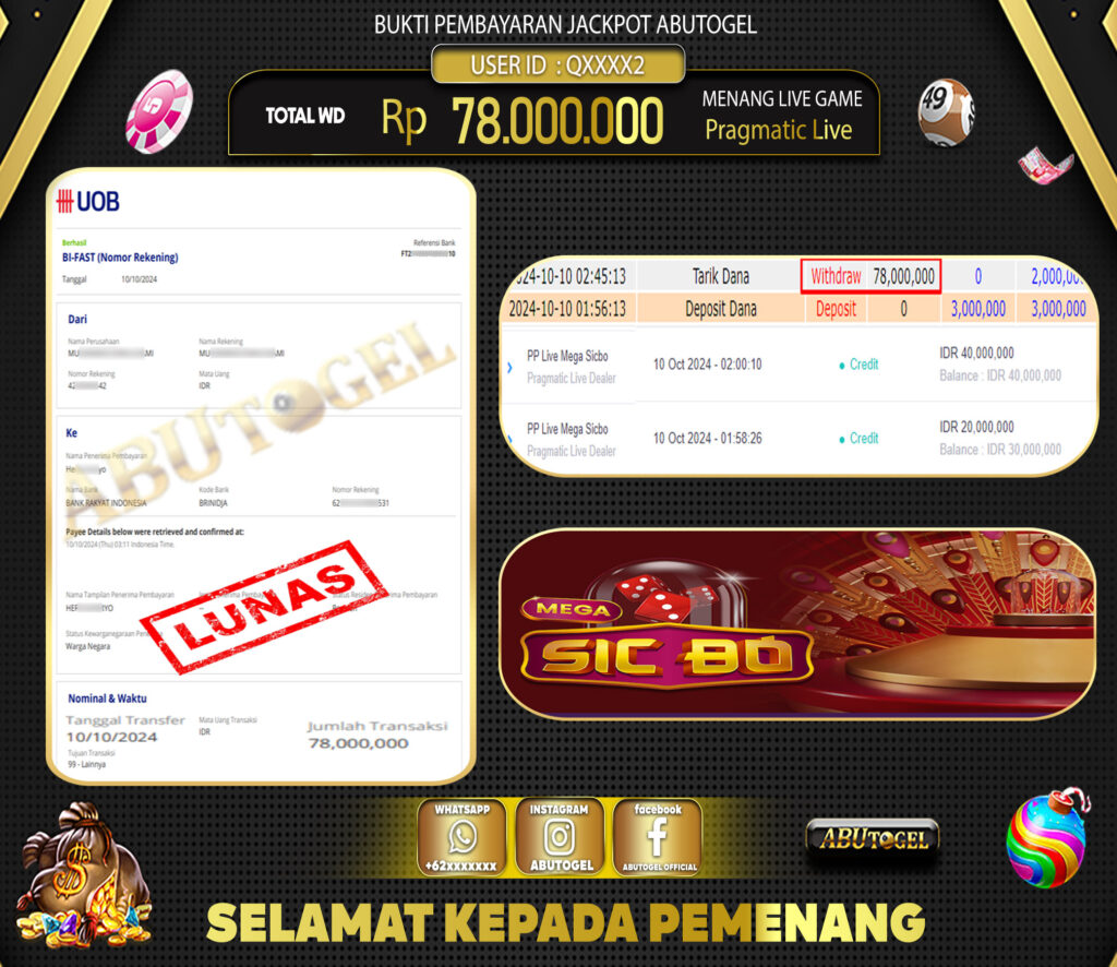 Bukti transfer yang kami publis adalah bukti kemengan player di atas 30 juta dan sudah kami bayar lunas tanpa di cicil. Untuk bukti pembayaran lainnya kalian dapat langsung melihatnya di group facebook resmi abutogel.
