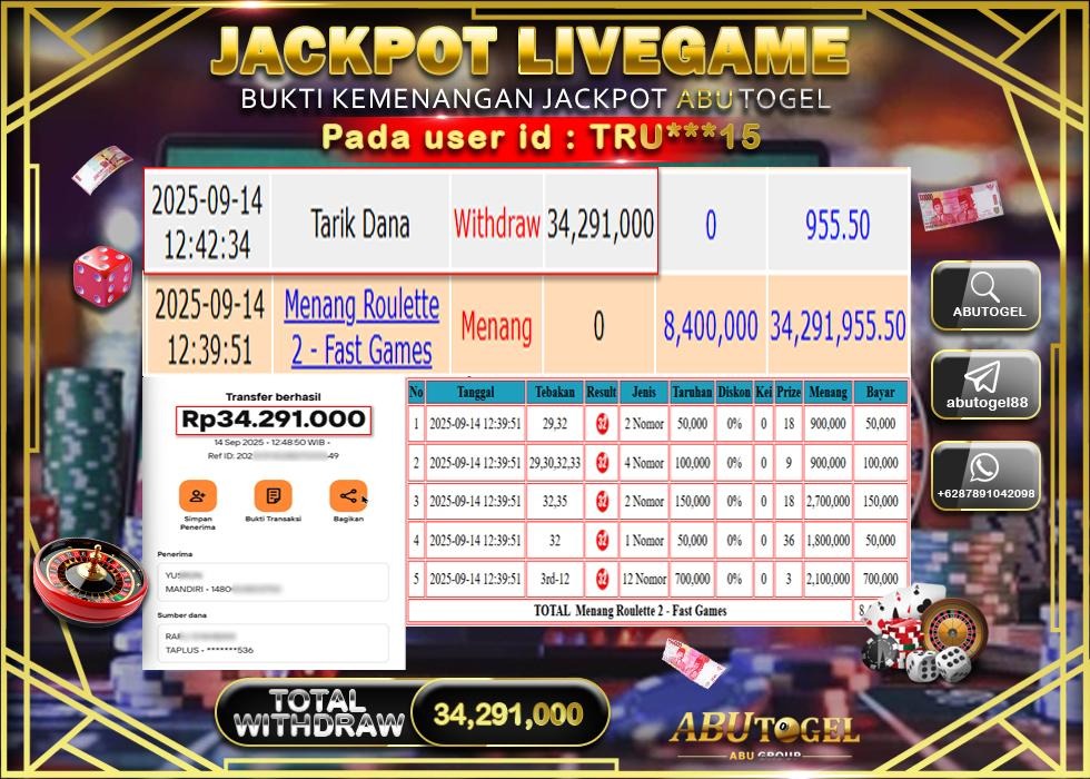Bukti Jackpot ABUTOGEL Live Casino Minggu 14 September 2025