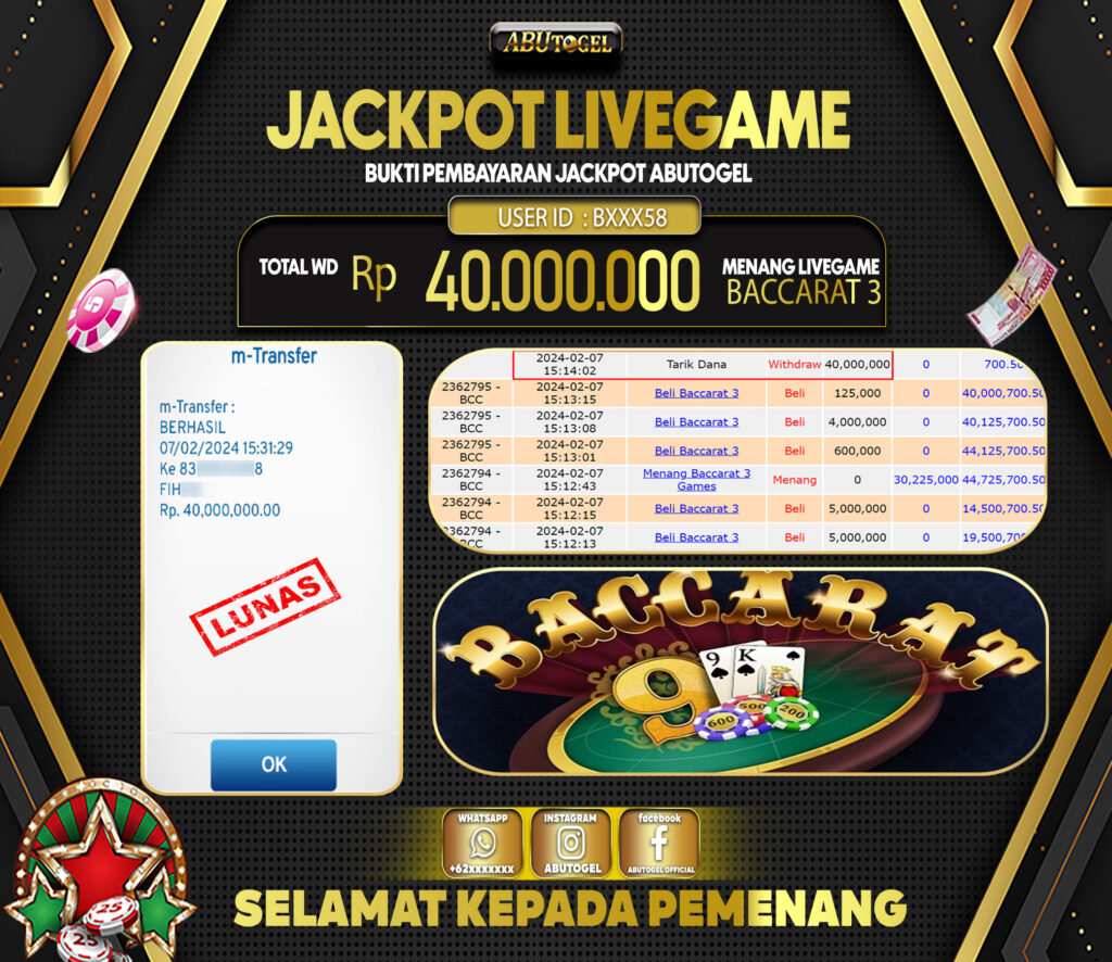 Berikut adalah Bukti Jackpot ABUTOGEL Live Casino Rabu, 07 Februari 2024 :