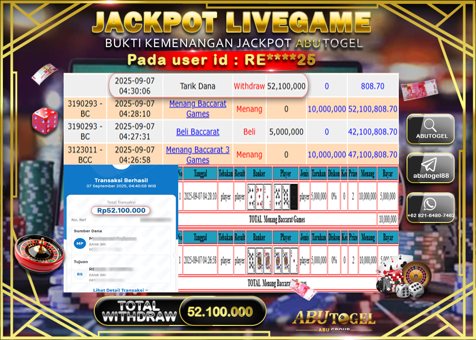 Bukti Jackpot ABUTOGEL Live Casino Minggu 07 September 2025