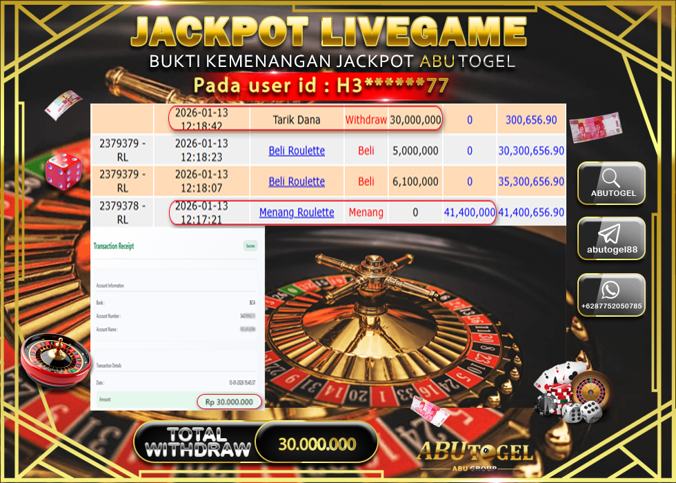 Berikut adalah Bukti Jackpot ABUTOGEL Live Casino Selasa 13 January 2026 :