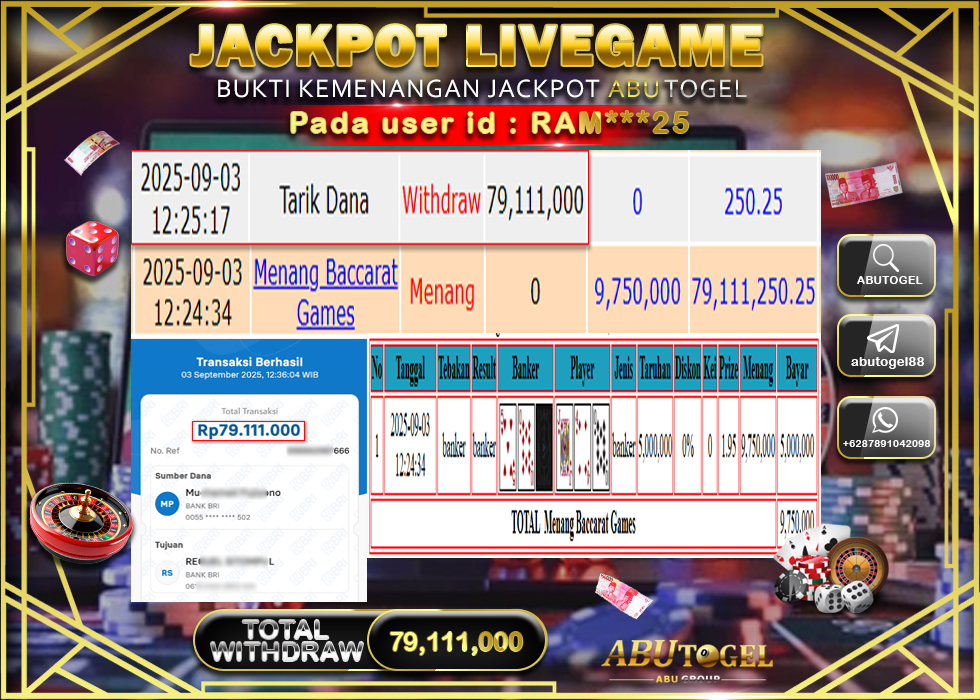 Berikut adalah Bukti Jackpot ABUTOGEL Live Casino Rabu 03 September 2025 :