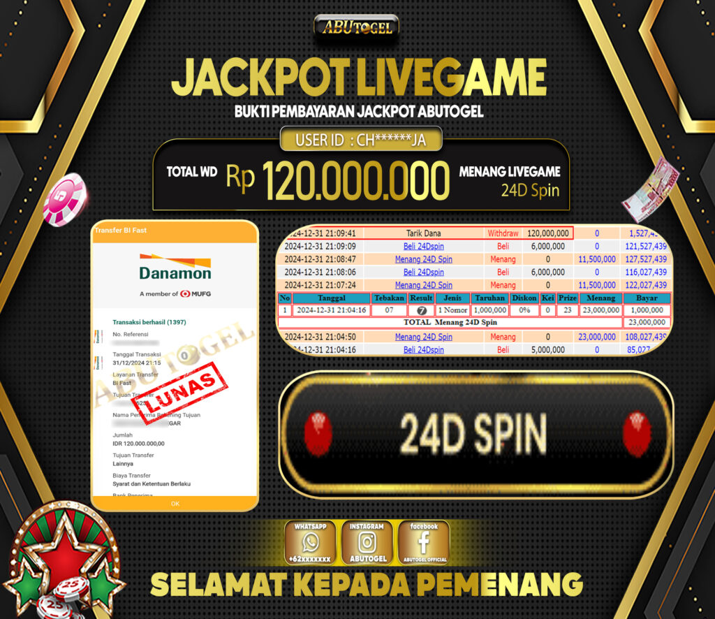 Berikut adalah Bukti Jackpot ABUTOGEL Live Casino Selasa, 31 Desember 2024 :