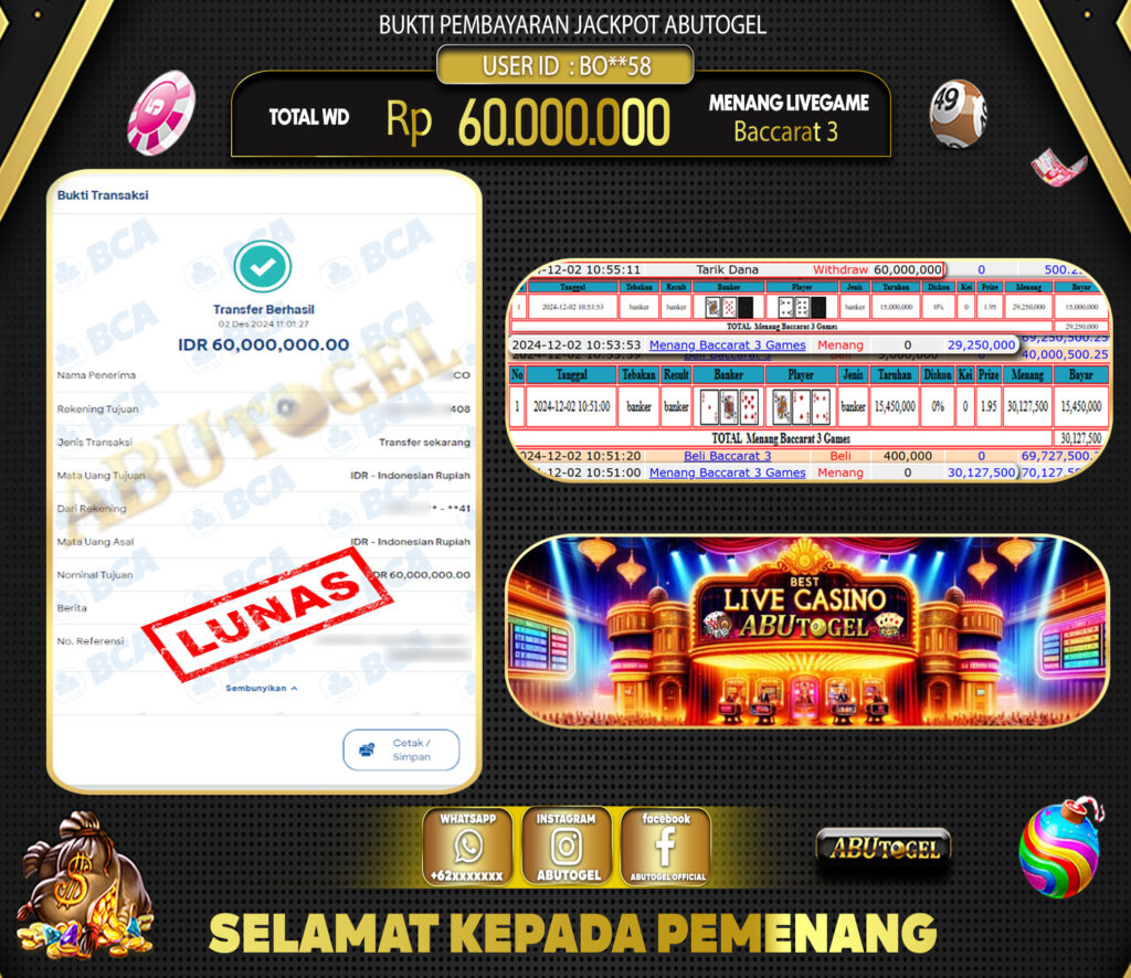 3 min readBukti Jackpot ABUTOGEL Live Casino Senin 02 Desember 2024 – ABUTOGEL adalah situs live casino terpercaya. Berikut ini kami berikan info buktu jackpot member abutogel yang sudah kami bayar lunas dalam permainan live casino.