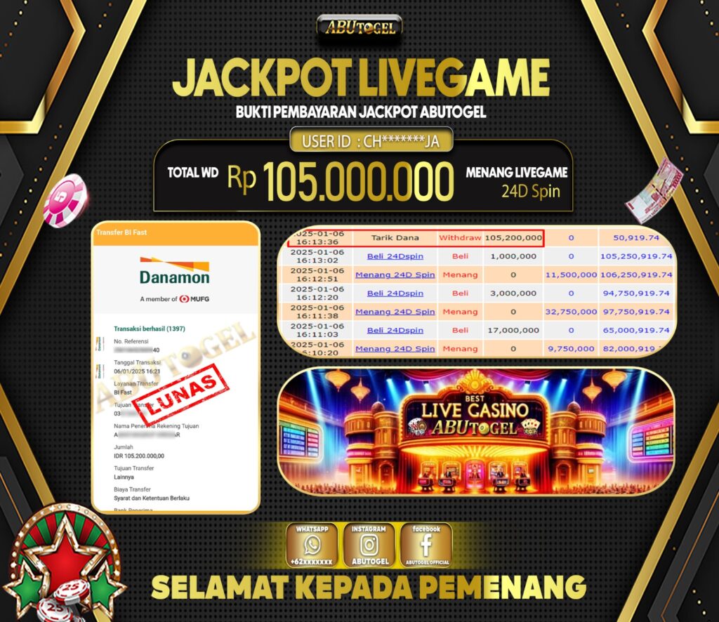 Berikut adalah Bukti Jackpot ABUTOGEL Live Casino Senin, 06 Januari 2025 :