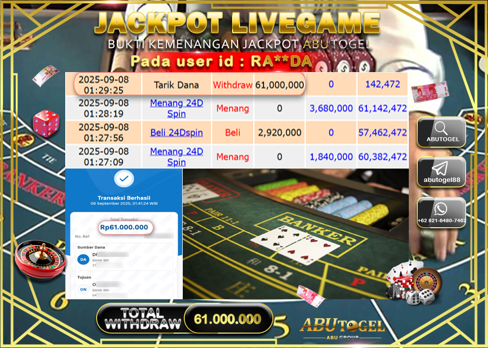 Berikut adalah Bukti Jackpot ABUTOGEL Live Casino Senin 08 September 2025 :