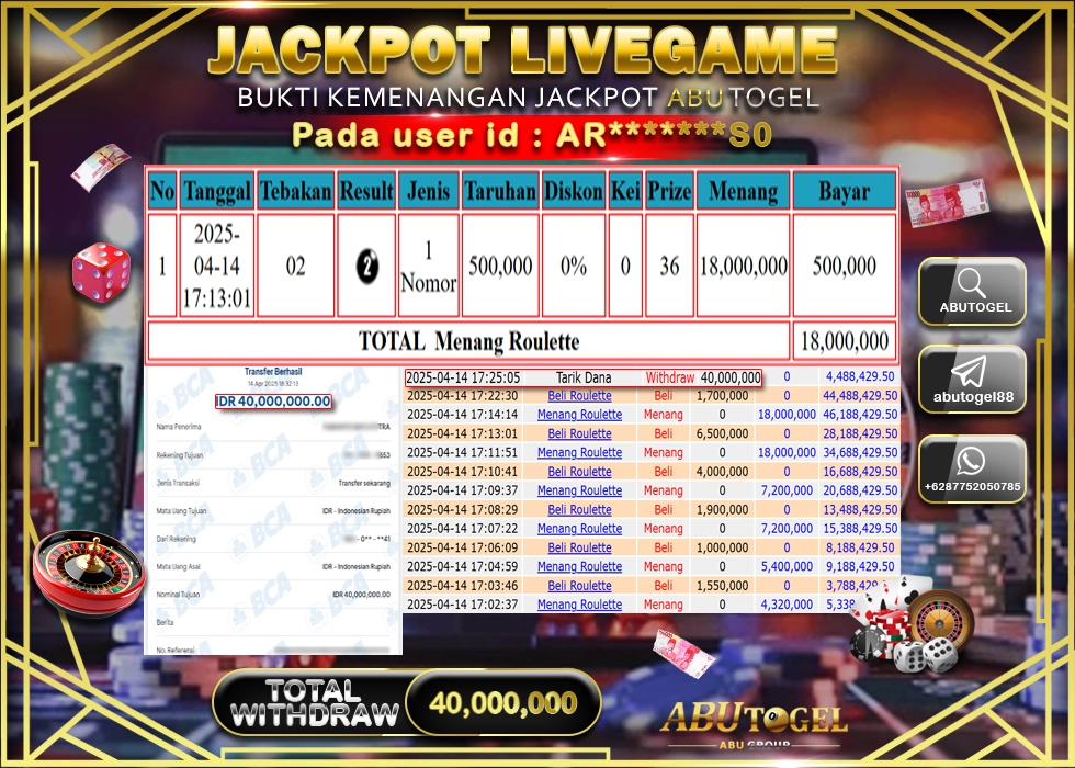 Berikut adalah Bukti Jackpot ABUTOGEL Live Casino Senin, 14 April 2025 :