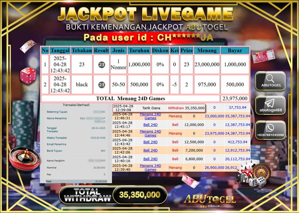 Bukti Jackpot ABUTOGEL Live Casino Senin 28 April 2025