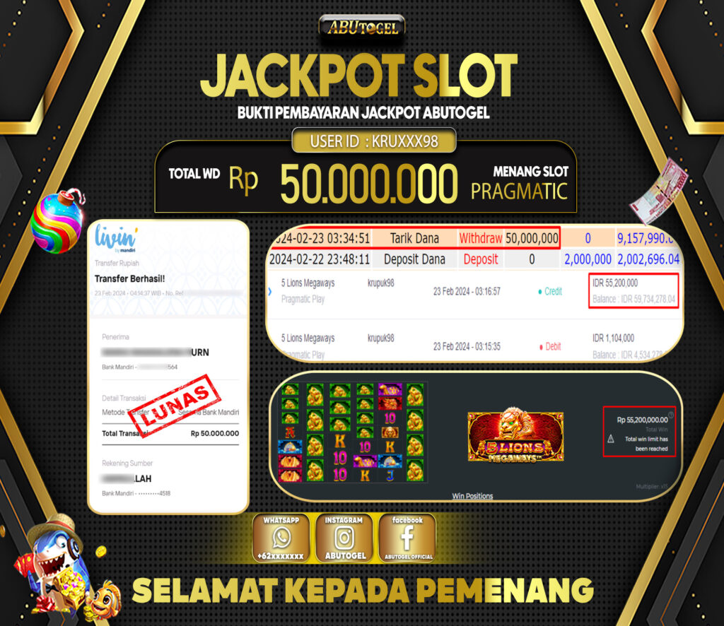 Berikut adalah Bukti Jackpot ABUTOGEL Slot Online Jumat, 23 Februari 2024 :