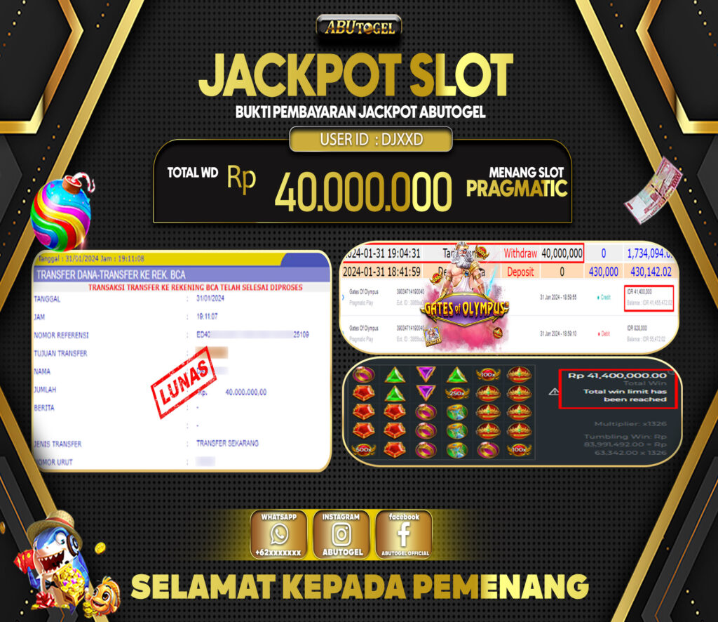 3 min readBukti Jackpot ABUTOGEL Slot Online Kamis 01 Februari 2024 – ABUTOGEL adalah situs slot gacor maxwin terpercaya. Berikut ini kami berikan info buktu jackpot member ABUTOGEL yang sudah kami bayar lunas dalam permainan slot gacor.