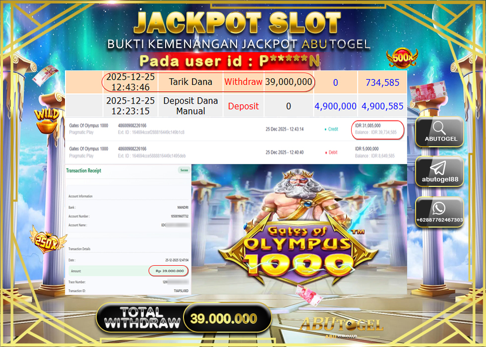 Berikut adalah Bukti Jackpot Slot Online ABUTOGEL Kamis 25 Desember 2025 :