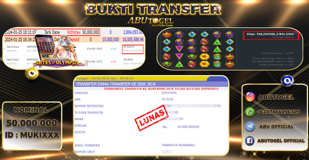 Bukti transfer yang kami publis adalah bukti kemengan player di atas 30 juta dan sudah kami bayar lunas tanpa di cicil. Untuk bukti pembayaran lainnya kalian dapat langsung melihatnya di group facebook resmi ABUTOGEL.