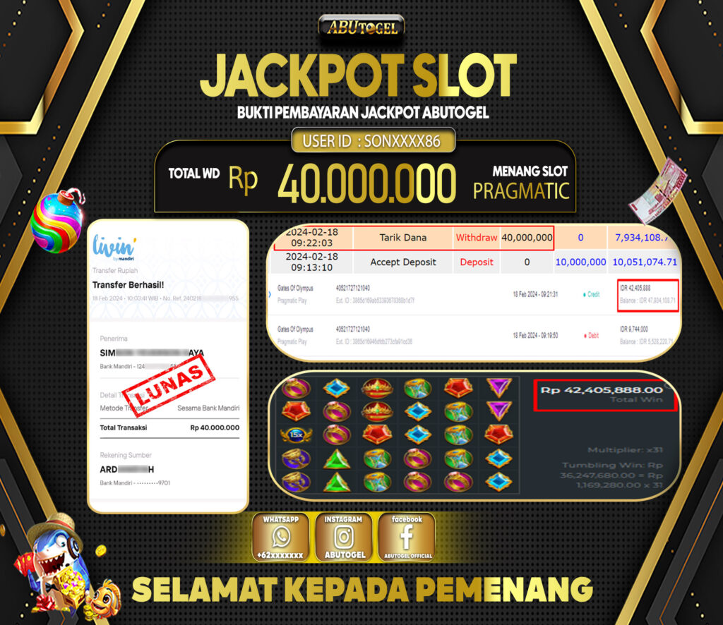 3 min readBukti Jackpot ABUTOGEL Slot Online Minggu 18 Februari 2024 – ABUTOGEL adalah situs slot gacor maxwin terpercaya. Berikut ini kami berikan info buktu jackpot member ABUTOGEL yang sudah kami bayar lunas dalam permainan slot gacor.