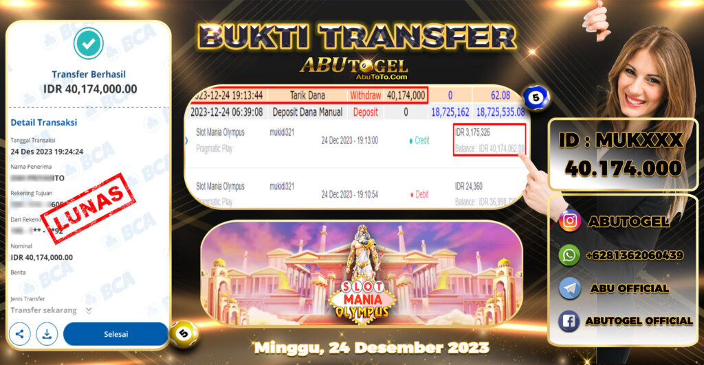 Berikut adalah Bukti Jackpot ABUTOGEL Slot Online Minggu 24 Desember 2023 :