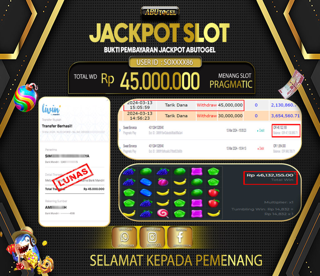 3 min readBukti Jackpot ABUTOGEL Slot Online Rabu 13 Maret 2024 – ABUTOGEL adalah situs slot gacor maxwin terpercaya. Berikut ini kami berikan info buktu jackpot member ABUTOGEL yang sudah kami bayar lunas dalam permainan slot gacor.