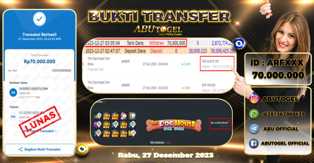 Bukti transfer yang kami publis adalah bukti kemengan player di atas 30 juta dan sudah kami bayar lunas tanpa di cicil. Untuk bukti pembayaran lainnya kalian dapat langsung melihatnya di group facebook resmi ABUTOGEL.
