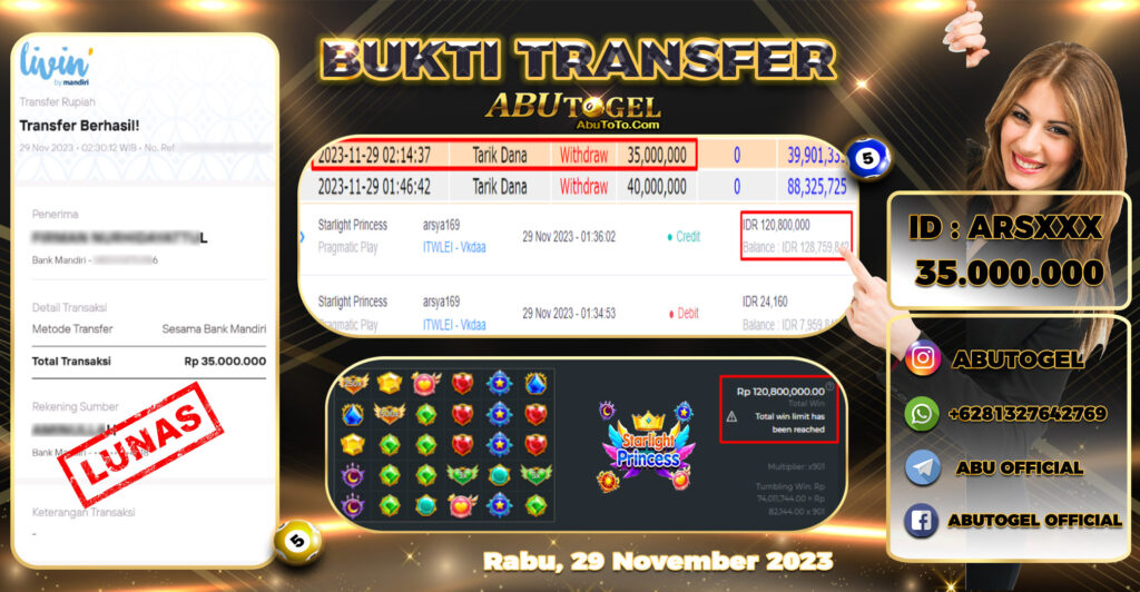 Bukti transfer yang kami publis adalah bukti kemengan player di atas 30 juta dan sudah kami bayar lunas tanpa di cicil. Untuk bukti pembayaran lainnya kalian dapat langsung melihatnya di group facebook resmi ABUTOGEL.