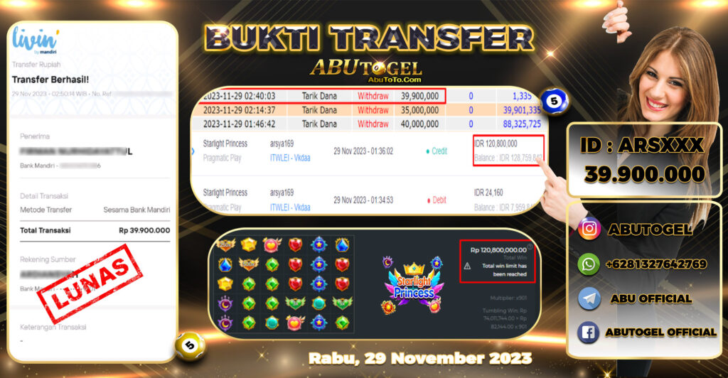 Berikut adalah Bukti Jackpot ABUTOGEL Slot Online Sabtu 29 November 2023 :