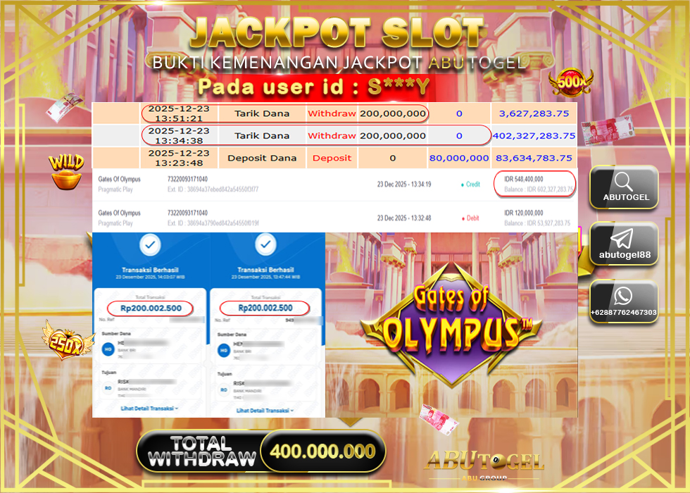 Berikut adalah Bukti Jackpot Slot Online ABUTOGEL Selasa 23 Desember 2025 :