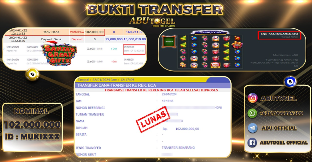 Bukti transfer yang kami publis adalah bukti kemengan player di atas 30 juta dan sudah kami bayar lunas tanpa di cicil. Untuk bukti pembayaran lainnya kalian dapat langsung melihatnya di group facebook resmi ABUTOGEL.