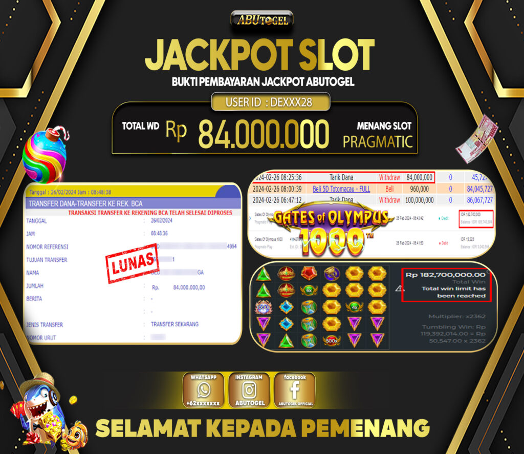 3 min readBukti Jackpot ABUTOGEL Slot Online Senin 26 Februari 2024 – ABUTOGEL adalah situs slot gacor maxwin terpercaya. Berikut ini kami berikan info buktu jackpot member ABUTOGEL yang sudah kami bayar lunas dalam permainan slot gacor.