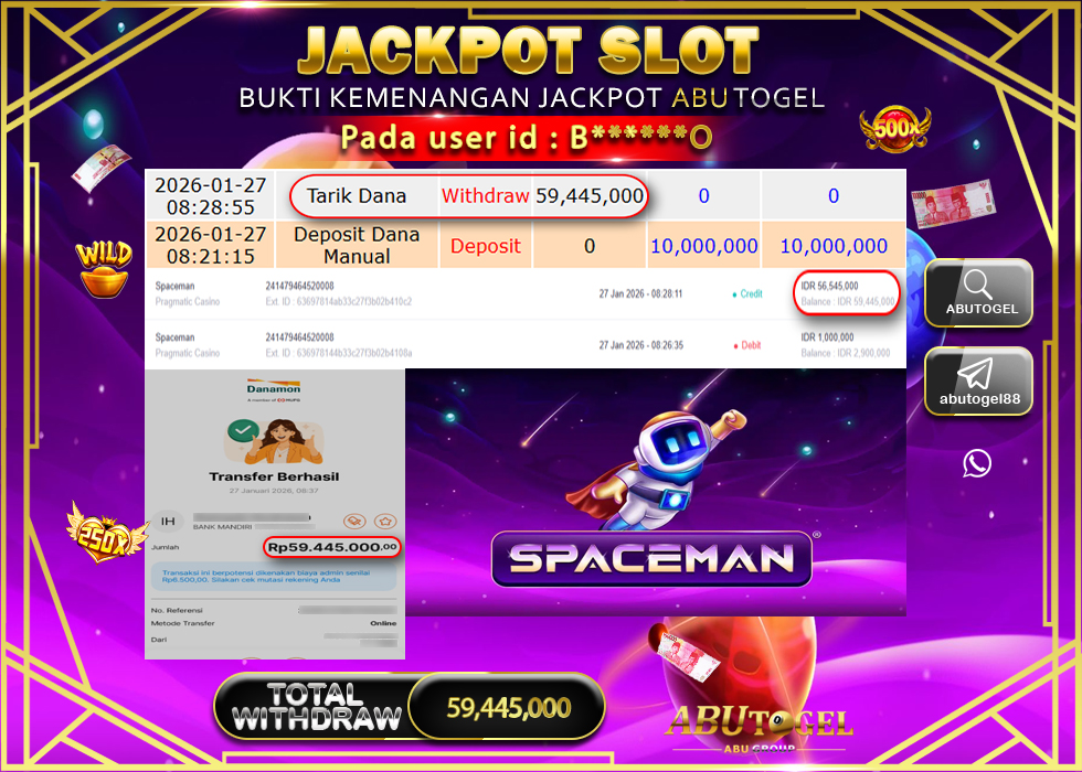 Berikut adalah Bukti Jackpot Slot Online ABUTOGEL Selasa 27 January 2026 :