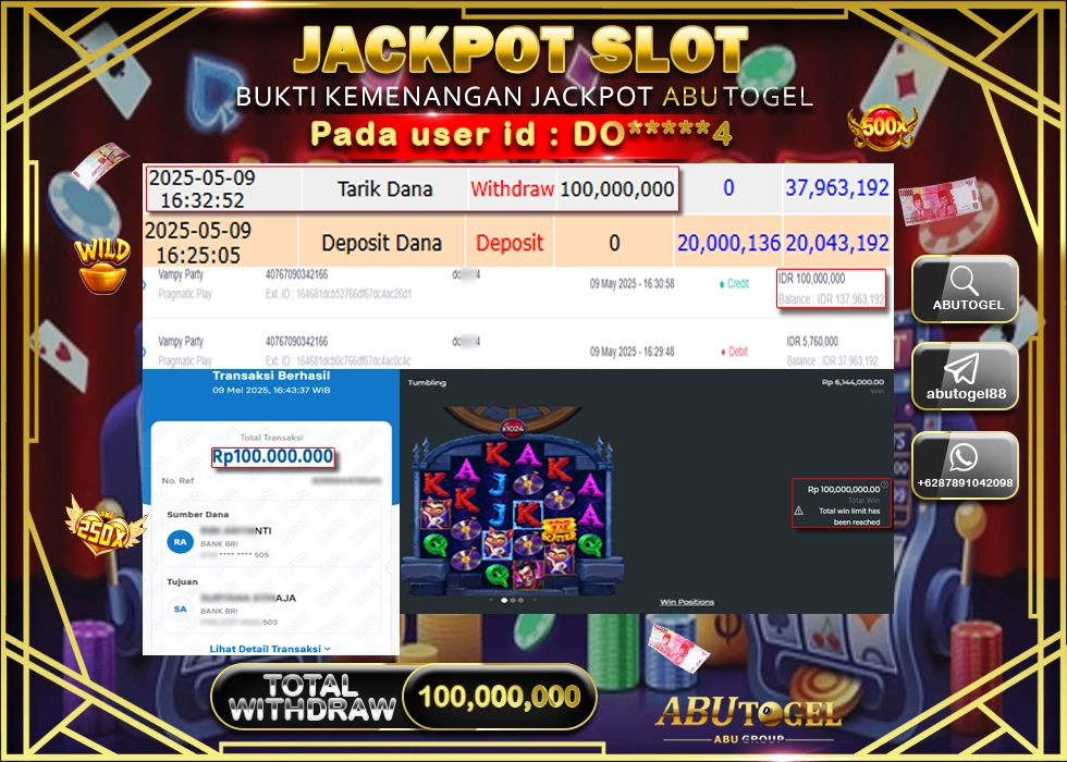 Berikut adalah Bukti Jackpot ABUTOGEL Slot Online Jumat, 09 Mei 2025 :