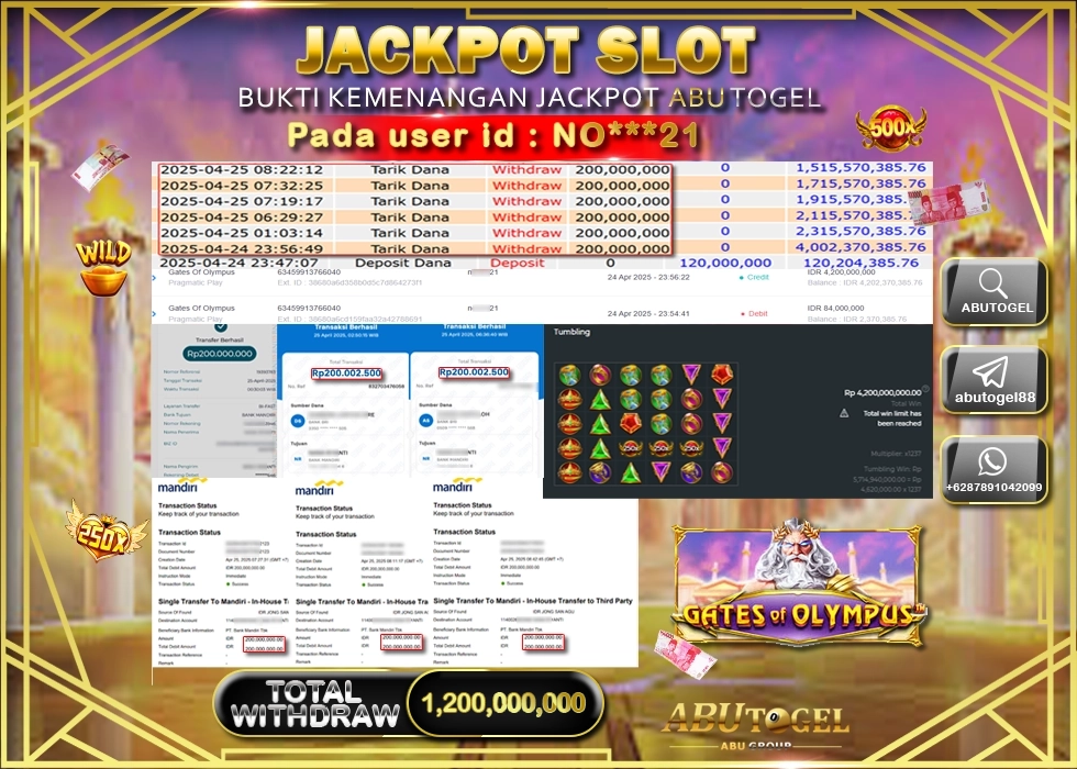 Berikut adalah Bukti Jackpot ABUTOGEL Slot Online Jumat, 25 April 2025 :