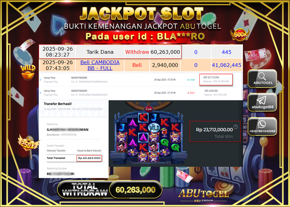 Berikut adalah Bukti Jackpot ABUTOGEL Slot Online Jumat 26 September 2025 :
