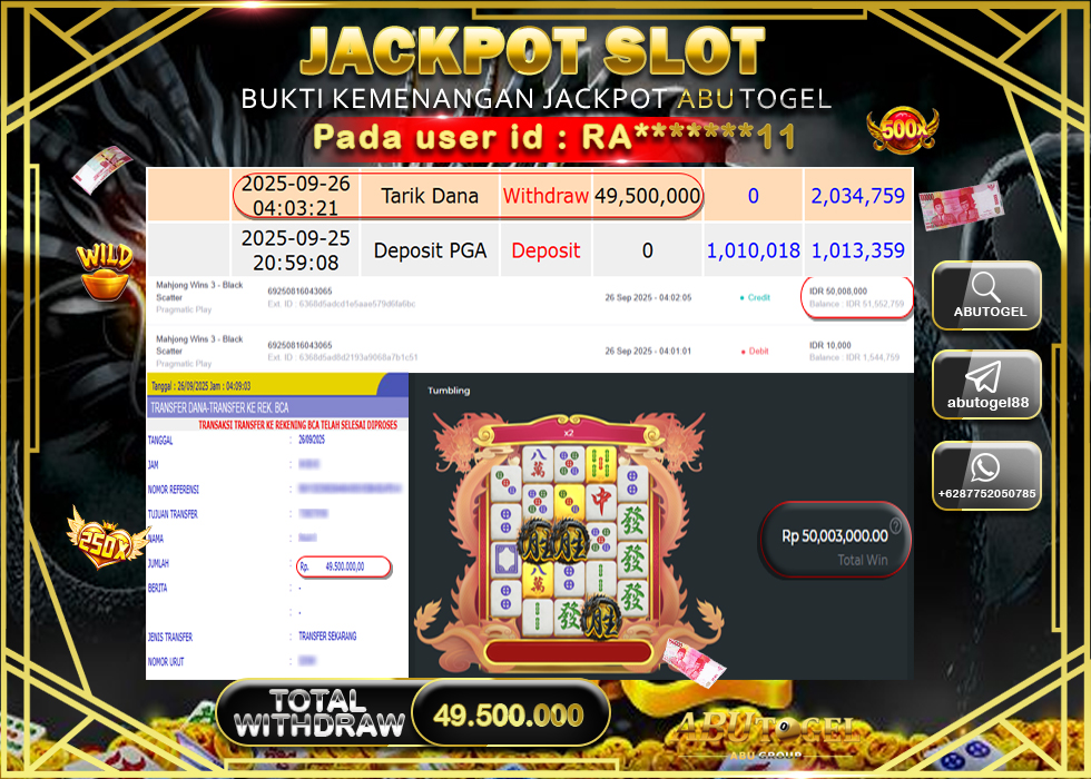 Berikut adalah Bukti Jackpot ABUTOGEL Slot Online Jumat 26 September 2025 :